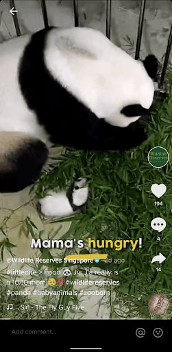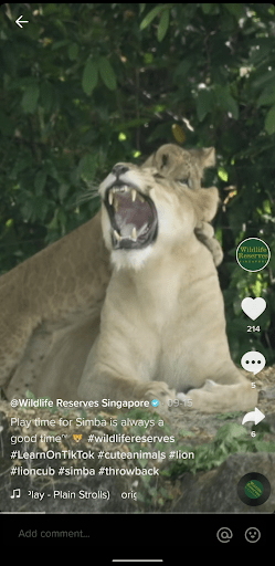 Apart from friendly cat videos, friendly tiger videos are also getting their fair share of views and followers on TikTok. Started in February 2021, Wildlife Reserves Singapore’s TikTok account (@wildlifereserves) posts cute videos of tigers, pandas, and other animals in our Singapore Safaris. Currently at 15.6k followers and 253.8k likes, the account is growing at a rapid pace. With an average of 30k views per post, its most viral video about a baby hippo garnered a whopping 1 million views and brought a lot of brand awareness to our local animal enclosures.