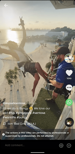 Created in March 2021, Skypark Sentosa’s @skyparksentosa rapidly growing TikTok account now has 44.5k followers and 762k post likes. Amid the travel restrictions of COVID-19, this is no easy feat for a tourism account that is less than a year old. Armed with videos of jaw-dropping bungee jumps and creative edits, they have pulled in an average of 50k – 100k views across their posts, with their most viral video reaching 15 million views so far.
