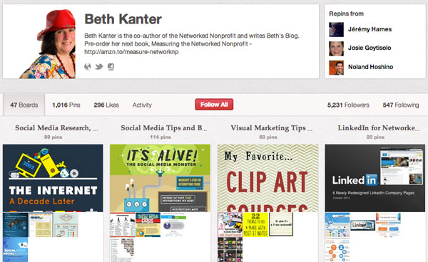 This pin board from @kanter, the co-author of the Networked Nonprofit, includes infographics that summarize data and research about social media tools, platforms, and trends.