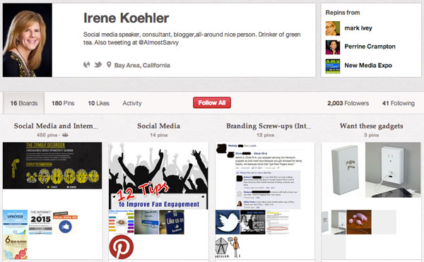 @LisaMLoeffler the Principal Consultant at Genuine Media is a qualified Pinterest addict with more than 700 pins. Her boards are full of social media insights. Be sure to check out her variety of boards.