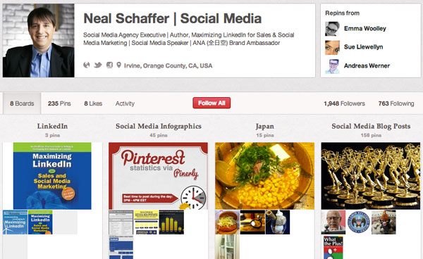@NealSchaffer is a leading social media strategist(A Forbes Top 30 Social Media Power Influencer and creator of the AdAge Top 100 Global Marketing Blog Windmill Networking), and you can expect a lot of useful tips from him on Pinterest. Apart from showcasing social media related infographics, you can also find other interesting boards for example “Top Social Media Books worth-reading” and “Social media superstars”.