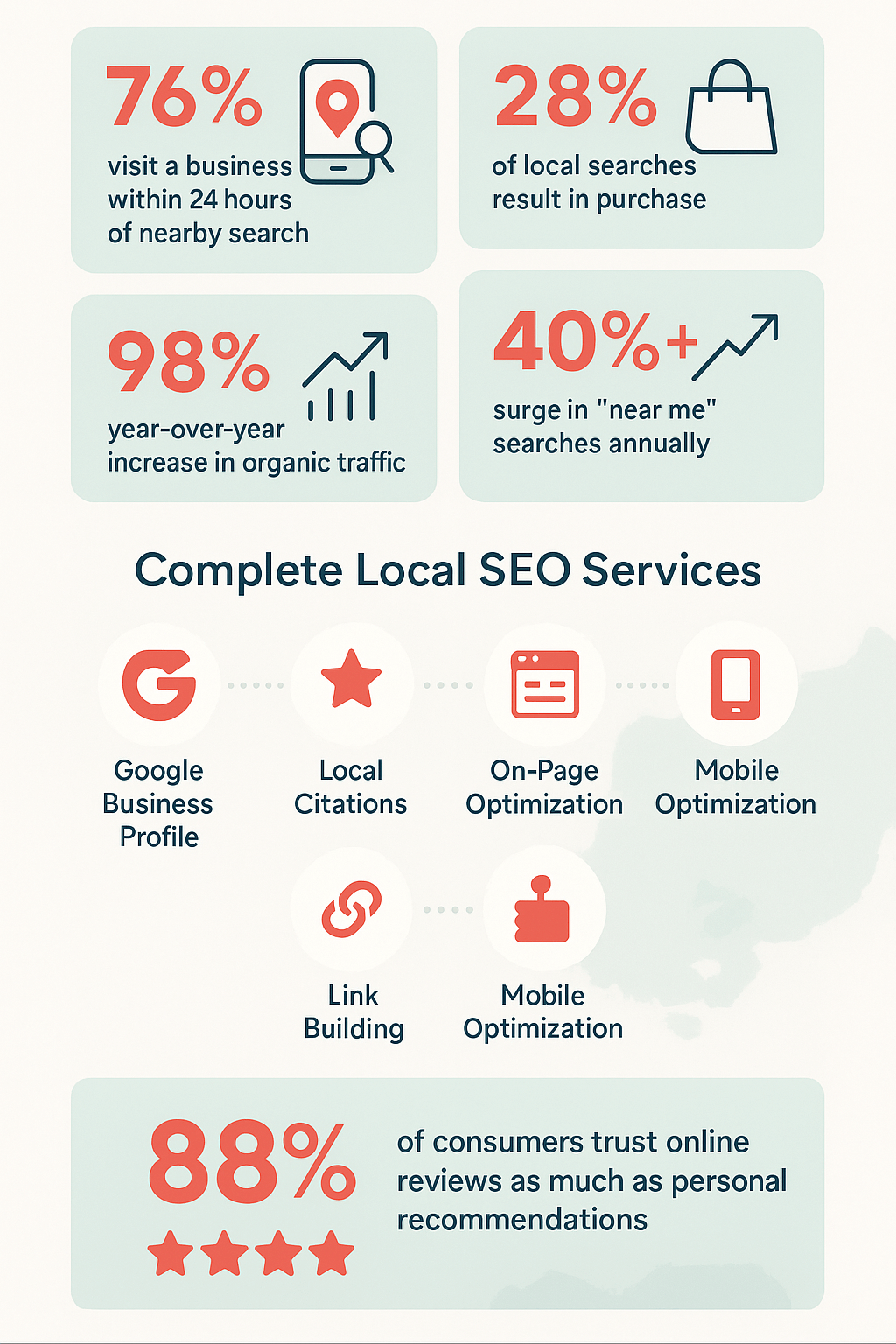 Nearly half of all Google searches have local intent—”near me,” location-specific queries, or Google Maps searches.